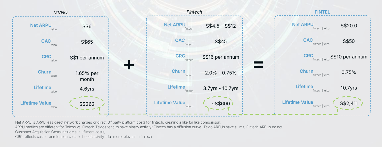 While a standard MVNO model might see a lifetime value of S$262, a Fintel-integrated model can reach S$2,411—a nearly 10x increase.